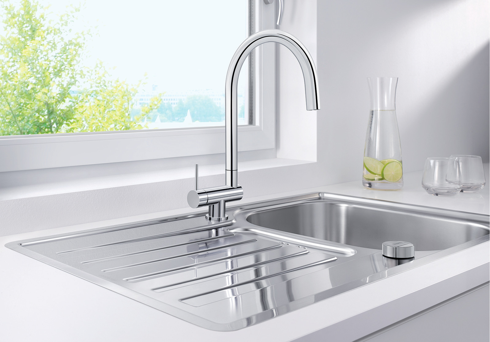 Складной смеситель для установки перед окном Blanco Coressa-F выпускается в двух вариантах: с рычагом справа и слева. Очень удобный смеситель, который подойдет вам, если вы решили установить кухонную мойку перед окном: высокий излив смесителя легко складывается, наклоняясь вперед.